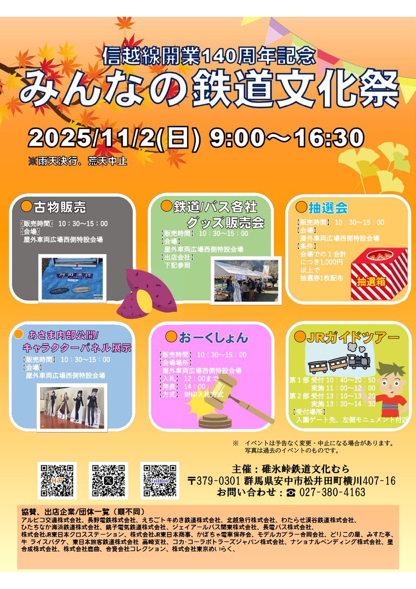 来る、11月2日(日) 碓氷峠鉄道文化むらで開催される 「みんなの鉄道文化祭」に… 長電バス初出店します🎊 (゚∀゚ノノ゛パチパチ 群馬県にお邪魔しまっす💨 出店企業さんが豪華~✨ 催しが盛り盛り🎯楽しみ~⤴️⤴️ ぜひご家族でお出かけくださ~い👨👩👧💨 #碓氷峠鉄道文化むら #みんなの鉄道文化祭
