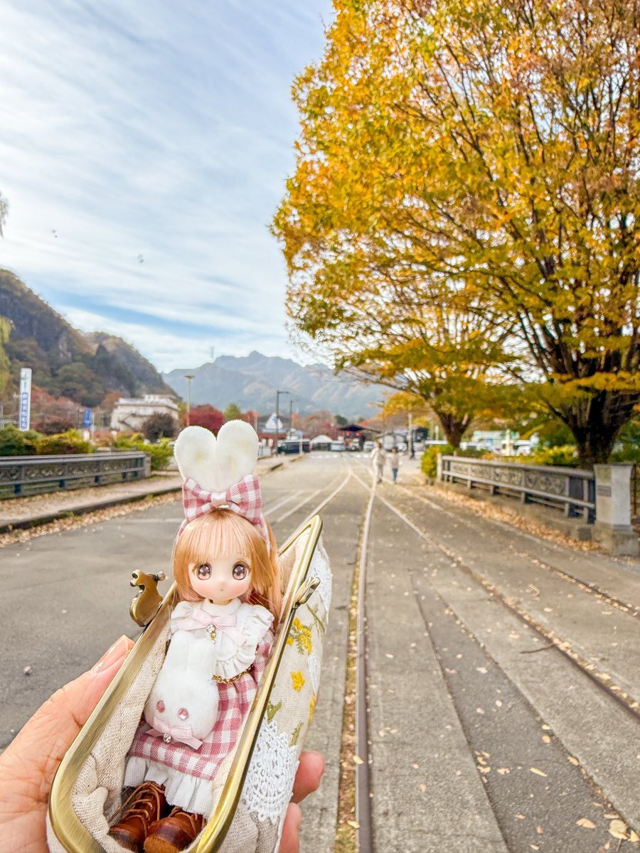 横川駅そばの駐車場から碓氷峠鉄道文化むらに向けてまっすぐ続く線路跡。「この景色、めちゃくちゃ萌えポイントだーっ😍✨✨」って大興奮の私と、早く文化むらに入りたいダンナ氏😂デカい木がまた最高だよね🌳🥰💕 #シュガーカップス #メモワールカネット #オレンジペコバッグ x.com/chirinote/stat…