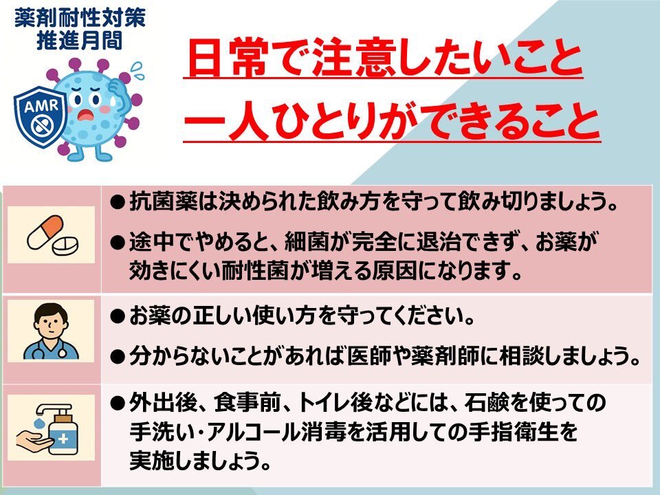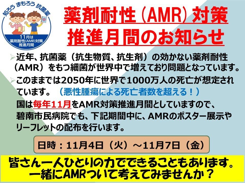 ◤ポスター展示、リーフレットの配布をします💊◢ 毎年11月は国が設定した「薬物耐性(AMR)対策推進月間」です。 それにあわせて当院でも11月4日(火)〜11月7日(金)の間、ポスター展示やリーフレットの配布をします。AMRについて考えてみませんか? #碧南市民病院 #薬物耐性(AMR)対策推進月間 pic.x.com/PqKWdKe3ik