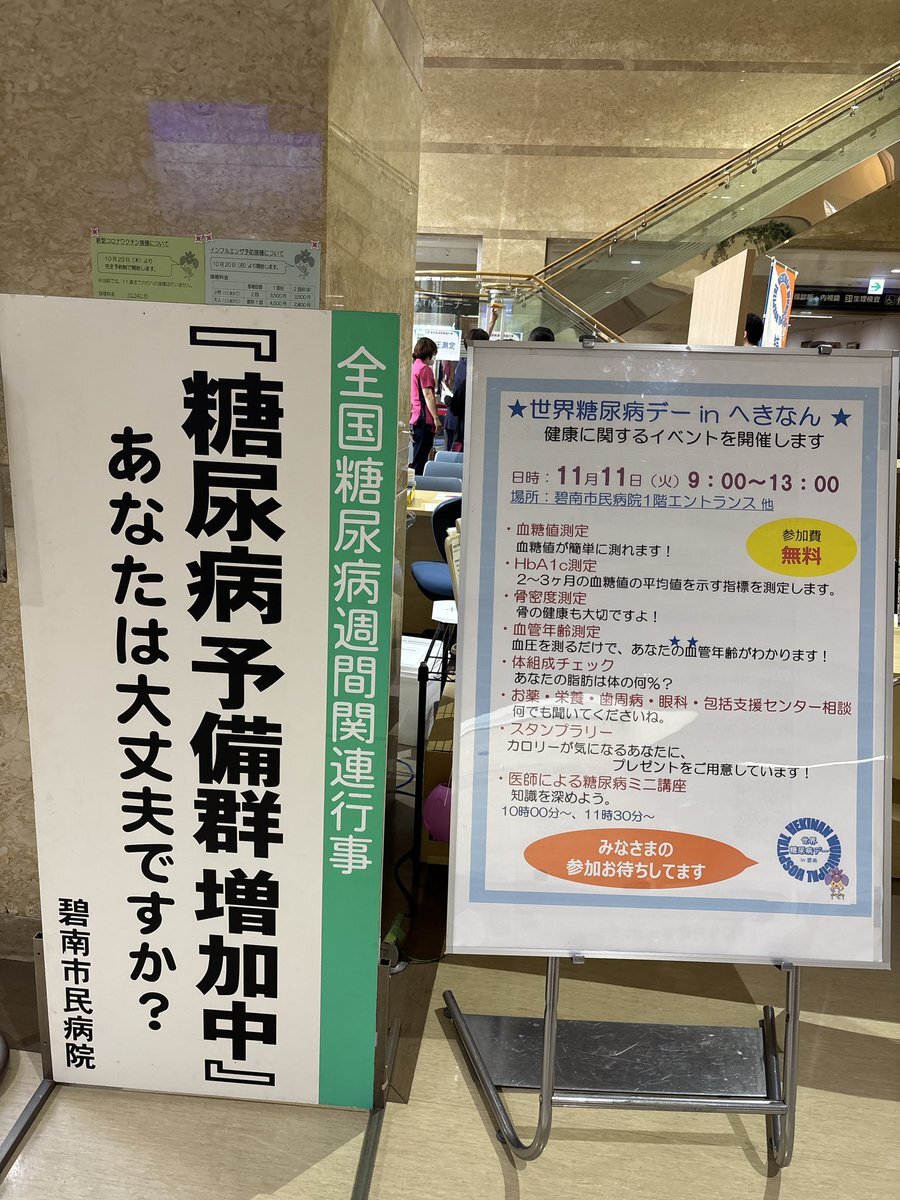◤イベントを行いました◢ 11月11日、「世界糖尿病デー in へきなん」を開催しました! HbA1cや血糖値などの測定、講座を通じてご自身の健康と向き合う機会になっていだたけたら幸いです😊 参加いただいた皆様、ありがとうございました! #碧南市民病院 #世界糖尿病デー pic.x.com/VD0GMTSMn6