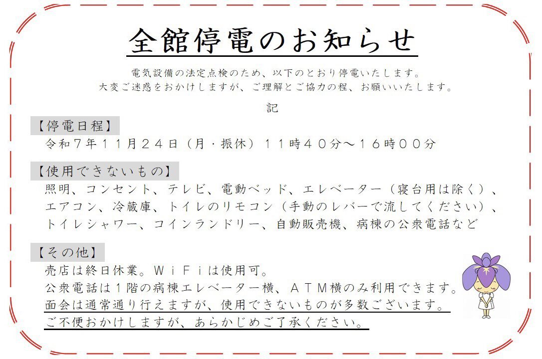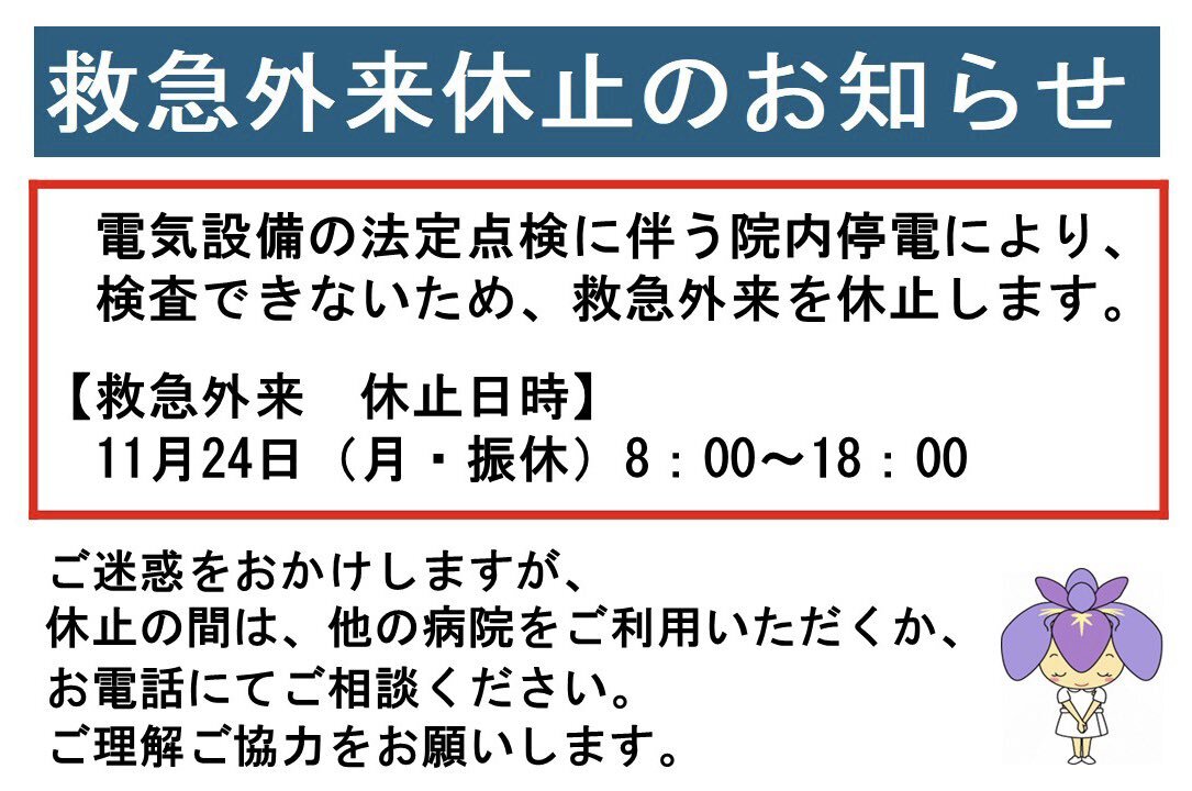 ◤当院よりお知らせ◢ 電気設備の法定点検のため、11月24日(月・振休)11:40〜16:00の間、全館停電によりエレベーターが利用できません。 また、8:00〜18:00の間は救急外来を休止させていただきます。 ご迷惑をおかけしますが、ご理解とご協力のほどよろしくお願いします。 #碧南市民病院 pic.x.com/3smJzYx0qs