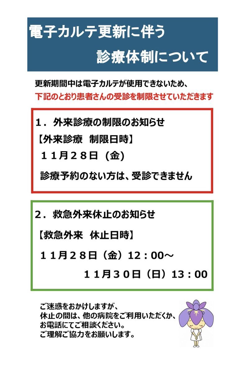 ◤電子カルテ更新に伴う診療体制について◢ 電子カルテ更新に伴うシステム停止により、外来診療の制限・救急外来の休止をさせていただきます。休止の間は他の病院をご利用いただくか、お電話にてご相談ください。ご理解とご協力のほどよろしくお願いします。 #碧南市民病院 pic.x.com/Xuialx7osn