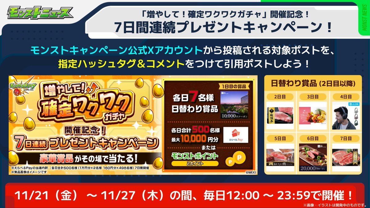 ✦••┈┈┈┈┈┈┈┈┈┈┈••✦ 増やして!#確定ワクワクガチャ 2日目! ✦••┈┈┈┈┈┈┈┈┈┈┈••✦ 限定キャラも排出対象の10連ガチャが 毎日無料で引ける! @monst_campaign で 選べる松阪牛ギフトカードや えらべるPayが当たるCPも開催中✨ monster-strike.com/news/20251120_… #モンスト pic.x.com/gRNZg8A2ou