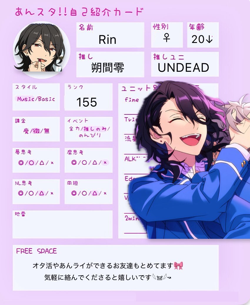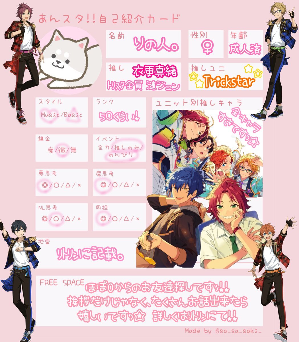 Tag🏷𓈒𓏸︎︎︎︎ ほぼ0からです🥺 社会人のあんスタPの方居ましたら繋がりたいです🙇♂️ 同担様は✖︎他担様〇 詳しくはリトリンへ 《lit.link/hm347》 ♻️or♡で気になる方お迎え行きます🚗💨 #あんスタ自己紹介カード #社会人のあんスタPと繋がりたい #成人済みあんスタPさんと繋がりたい