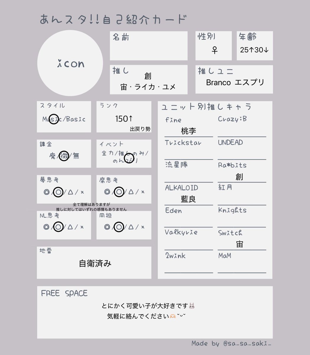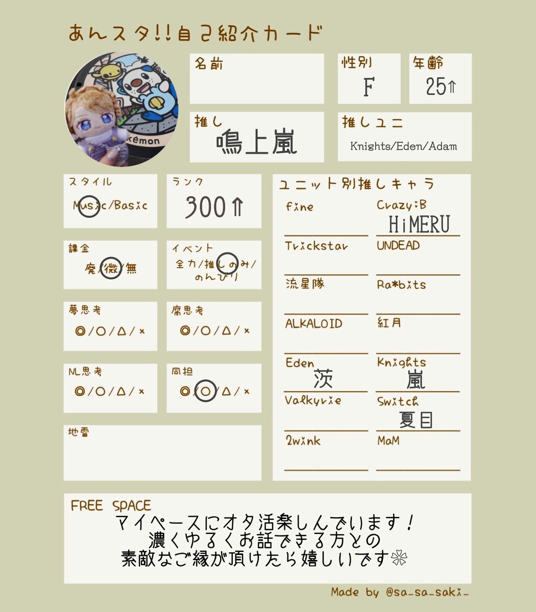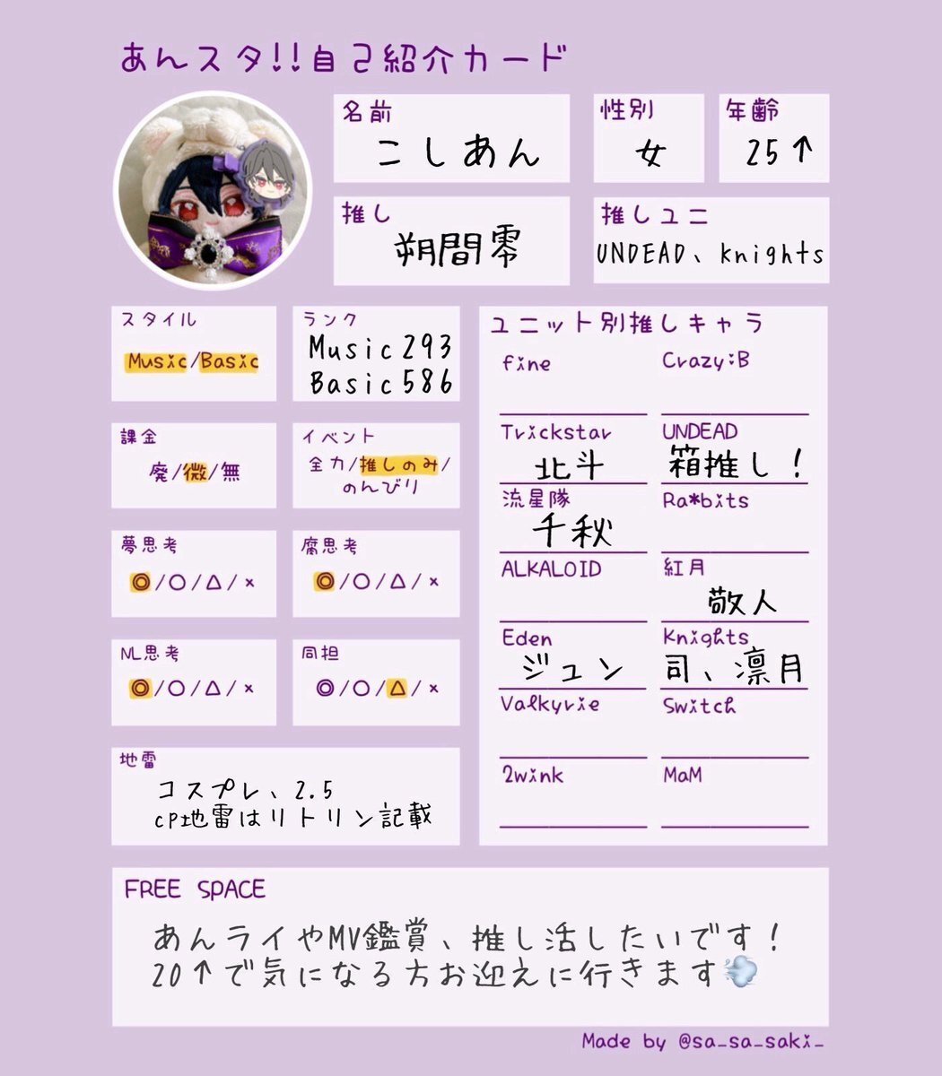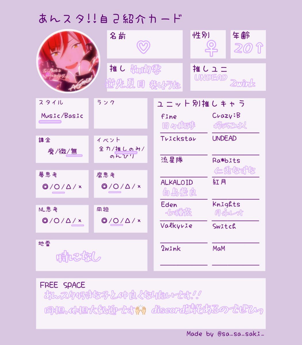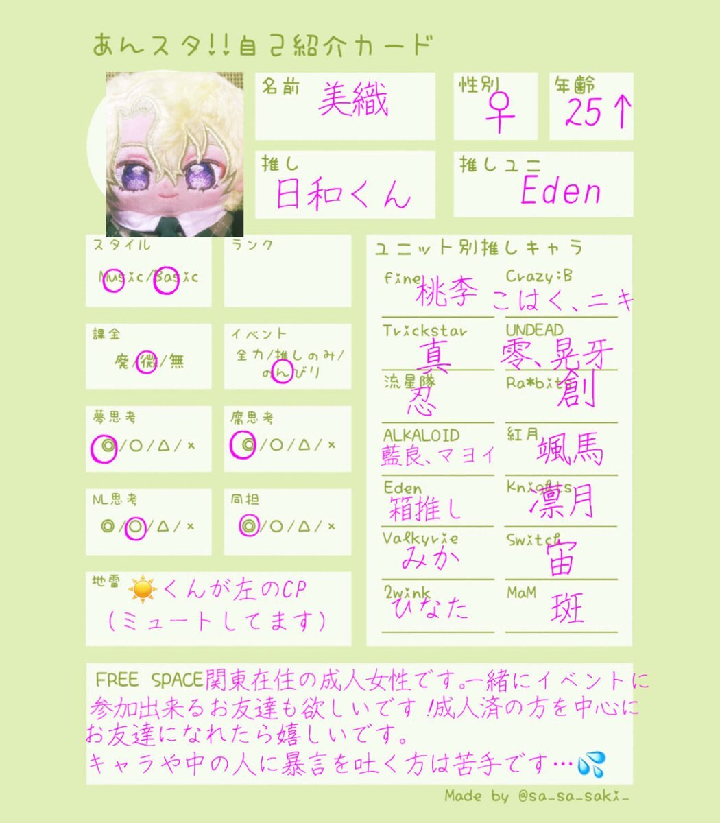 @0 25↑¦関東¦🚺 あんライや推し活したいです!! ↺ or ♡で気になった方お迎えします🌻 🔗 lit.link/54an #あんスタ自己紹介カード #あんスタ好きな人と繋がりたい #あんスタ好きと繋がりたい #成人済みあんスタPと繋がりたい #社会人あんスタPと繋がりたい