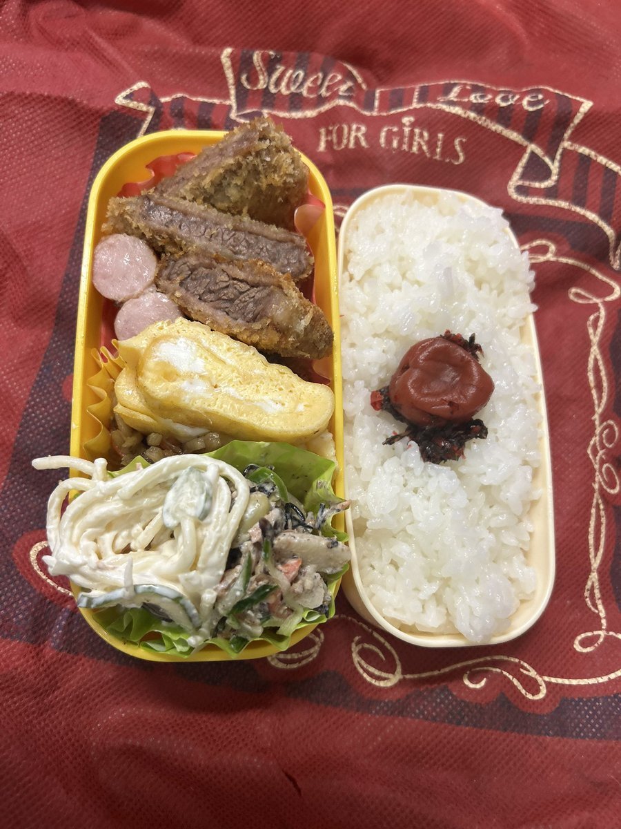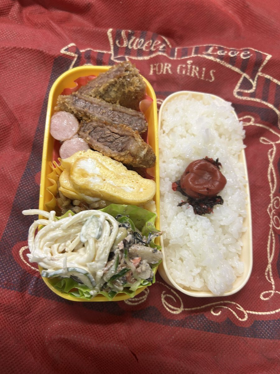#お弁当作り楽しもう部 #お弁当記録 #大学生弁当 #社会人弁当 #自分弁当 #802いただきます 火曜日✨ 昨日は 👨🦱の💻を エディオンにて ボーナス💸が🥹 電子レンジ買うの 忘れた🥹😳 今日もヨロシクデス🍱 トンカツ🐽 牛肉しぐれ煮🥩 竹輪キュー🥒ワサビマヨ だし巻き卵焼🍳 ウィンナー🥗 pic.x.com/rW2IINSMP6