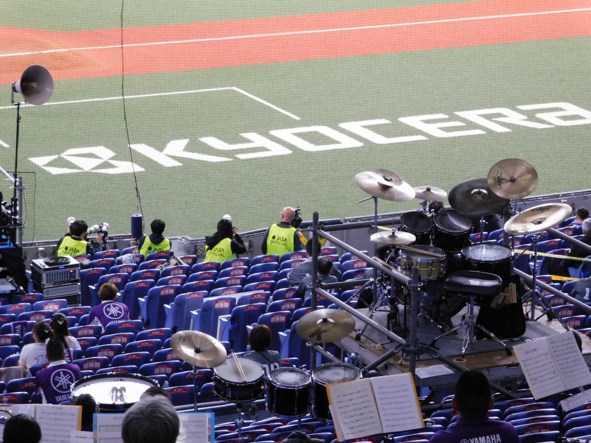 YAMAHAの応援ドラムはメイン(ドラムニキが叩くやつ)ともう1つ小さいのがある。 太鼓はドラムの近くに1つ、デカいやつはもう一方の足場に設営されとる。 楽譜が映り込んどるけど社外秘やないはずやからこのまま投稿する。 #社会人野球日本選手権大会 pic.x.com/CgJa2NlmW0