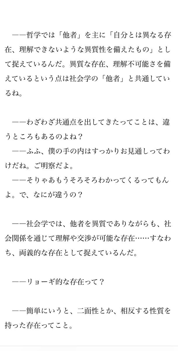🔍小学生に大学レベルの社会学を伝えるお仕事小説‼️ 「他者」と「他人」は違うの? 最新話『哲学・心理学・社会学が描く「他者と自己」それぞれの交点と違いとは?』公開しました‼️ #小説宣伝 #小学生 #社会学 #物語と学問の融合 novel.daysneo.com/sp/works/episo… pic.x.com/mkG8ps9p0r
