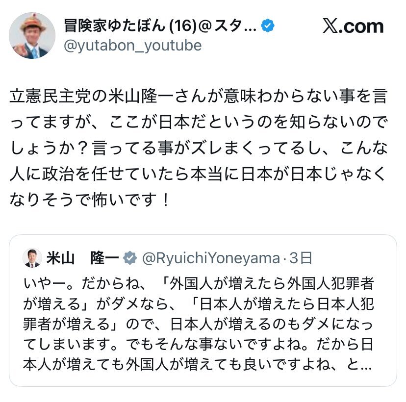 禿同 戦前なんて来てね〜よ。 大体お前戦前知らないだろ。 国会議員が憶測で反日やってんじゃねーよ、このクソ戯け。 それからお前芸名変えろよラ・サール高校に迷惑だろ、いつまで学歴自慢してんだクズ芸人。 #社民党いらない #左翼は卑劣極まり無い #高市政権は日本再生政権 x.com/tanakaseiji15/…