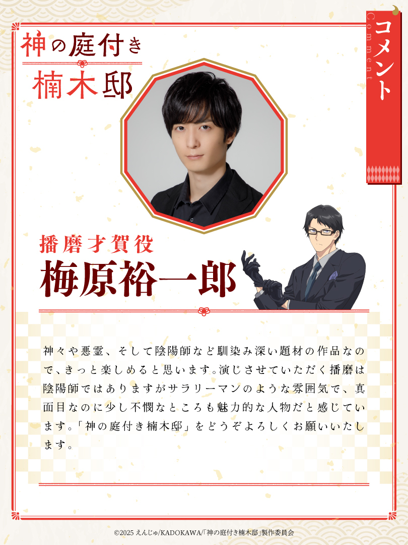 ┈┈┈┈┈🍃⛩️🍃┈┈┈┈┈    #神の庭付き楠木邸  キャスト情報・コメント公開 ┈┈┈┈┈🍃⛩️🍃┈┈┈┈┈ 🎙️播磨才賀役 #梅原裕一郎 さん 「演じさせていただく播磨は陰陽師ではありますがサ ラリーマンのような雰囲気で、真面目なのに少し不憫なところも魅力的な人物だと感じています。」 pic.x.com/bwr7BIFRBp