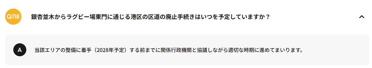 Q:銀杏並木からラグビー場東門に通じる港区の区道の廃止手続きはいつを予定していますか? A:当該エリアの整備に着手(2028年予定)する前までに関係行政機関と協議しながら適切な時期に進めてまいります。 #神宮外苑地区まちづくり #JinguGaien #計画の枠組み jingugaienmachidukuri.jp/faq/#anchor09 pic.x.com/nkNxjD9DmS