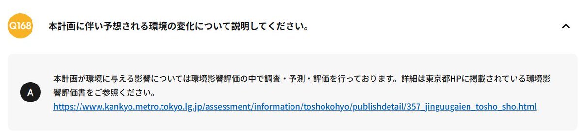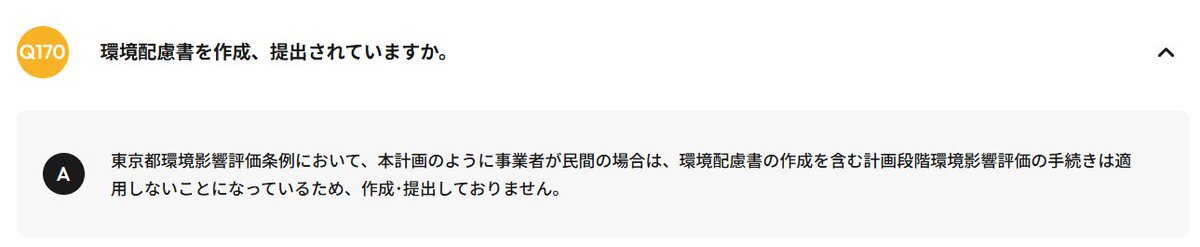Q:環境配慮書を作成、提出されていますか。 A:東京都環境影響評価条例において、本計画のように事業者が民間の場合は、環境配慮書の作成を含む計画段階環境影響評価の手続きは適用しないことになっているため、作成・提出しておりません。 #神宮外苑地区まちづくり #JinguGaien pic.x.com/ljxJV8jO91