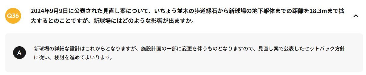 A:新球場の詳細な設計はこれからとなりますが、施設計画の一部に変更を伴うものとなりますので、見直し案で公表したセットバック方針に従い、検討を進めてまいります。 #神宮外苑地区まちづくり #JinguGaien #神宮球場 jingugaienmachidukuri.jp/faq/#anchor05 pic.x.com/73xs1EMuXt