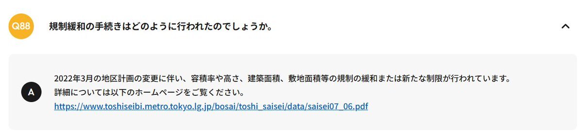 Q:規制緩和の手続きはどのように行われたのでしょうか。 A:2022年3月の地区計画の変更に伴い、容積率や高さ、建築面積、敷地面積等の規制の緩和または新たな制限が行われています。 詳細については以下のホームページをご覧ください。 toshiseibi.metro.tokyo.lg.jp/bosai/toshi_sa… #神宮外苑地区まちづくり pic.x.com/XaeUwlllbl
