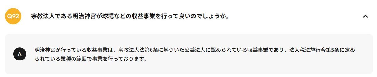 Q:宗教法人である明治神宮が球場などの収益事業を⾏って良いのでしょうか。 A:明治神宮が行っている収益事業は、宗教法⼈法第6条に基づいた公益法⼈に認められている収益事業であり、法⼈税法施⾏令第5条に定められている業種の範囲で事業を行っております。 #神宮外苑地区まちづくり pic.x.com/o6IDxxSRyv