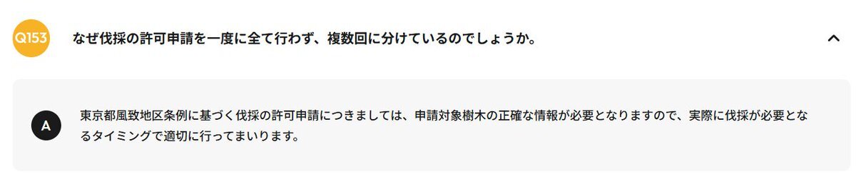 Q:なぜ伐採の許可申請を一度に全て行わず、複数回に分けているのでしょうか。 A:東京都風致地区条例に基づく伐採の許可申請につきましては、申請対象樹木の正確な情報が必要となりますので、実際に伐採が必要となるタイミングで適切に行ってまいります。 #神宮外苑地区まちづくり #JinguGaien pic.x.com/i0XdbNz4UR