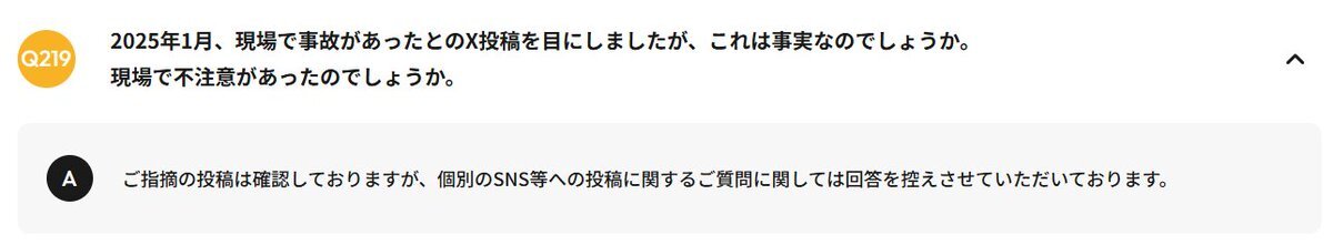 Q:2025年1月、現場で事故があったとのX投稿を目にしましたが、これは事実なのでしょうか。 現場で不注意があったのでしょうか。 A:ご指摘の投稿は確認しておりますが、個別のSNS等への投稿に関するご質問に関しては回答を控えさせていただいております。 #神宮外苑地区まちづくり #JinguGaien pic.x.com/91fl0rvYH8