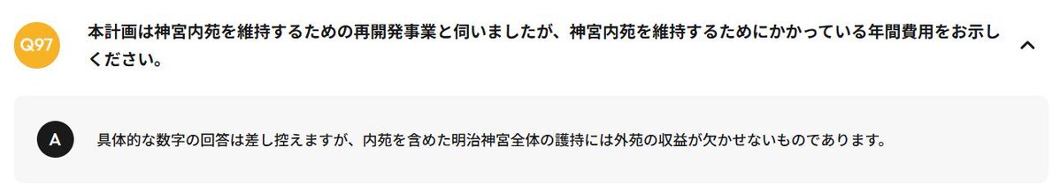 Q:本計画は神宮内苑を維持するための再開発事業と伺いましたが、神宮内苑を維持するためにかかっている年間費用をお示しください。 A:具体的な数字の回答は差し控えますが、内苑を含めた明治神宮全体の護持には外苑の収益が欠かせないものであります。 #神宮外苑地区まちづくり #JinguGaien pic.x.com/9XyQ2FGPKn