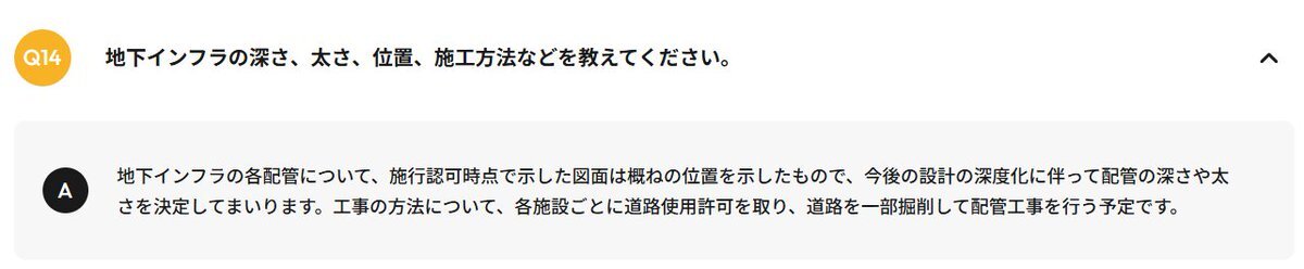 A:地下インフラの各配管について、施行認可時点で示した図面は概ねの位置を示したもので、今後の設計の深度化に伴って配管の深さや太さを決定してまいります。工事の方法について、各施設ごとに道路使用許可を取り、道路を一部掘削して配管工事を行う予定です。 #神宮外苑地区まちづくり pic.x.com/eUuIf78205