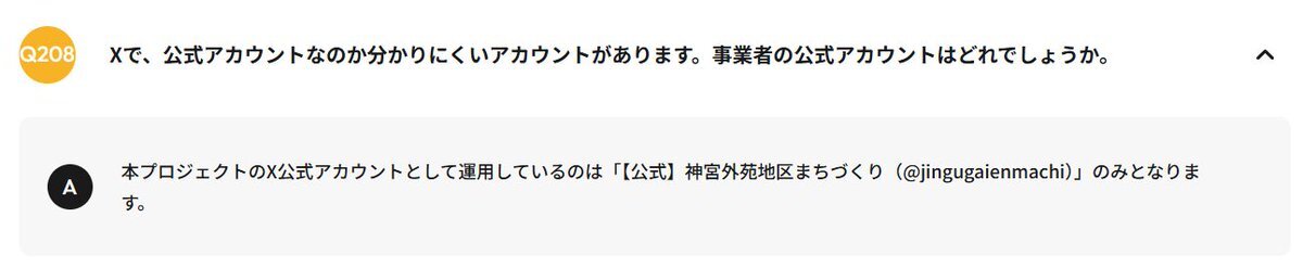 Q:Xで、公式アカウントなのか分かりにくいアカウントがあります。事業者の公式アカウントはどれでしょうか。 A:本プロジェクトのX公式アカウントとして運用しているのは「【公式】神宮外苑地区まちづくり(@jingugaienmachi)」のみとなります。 #神宮外苑地区まちづくり #JinguGaien pic.x.com/GA2NPbHYH4