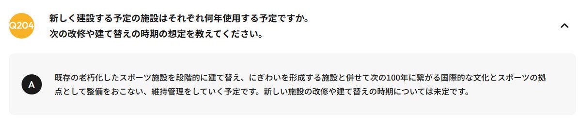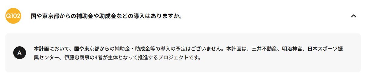 Q:国や東京都からの補助金や助成金などの導入はありますか。 A:本計画において、国や東京都からの補助金・助成金等の導入の予定はございません。本計画は、三井不動産、明治神宮、日本スポーツ振興センター、伊藤忠商事の4者が主体となって推進するプロジェクトです。 #神宮外苑地区まちづくり pic.x.com/wz6ygFATW5