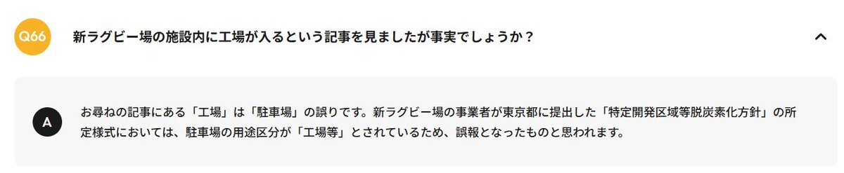 A:お尋ねの記事にある「工場」は「駐車場」の誤りです。新ラグビー場の事業者が東京都に提出した「特定開発区域等脱炭素化方針」の所定様式においては、駐車場の用途区分が「工場等」とされているため、誤報となったものと思われます。 #神宮外苑地区まちづくり #JinguGaien #秩父宮ラグビー場 pic.x.com/EFHUp0oWAb