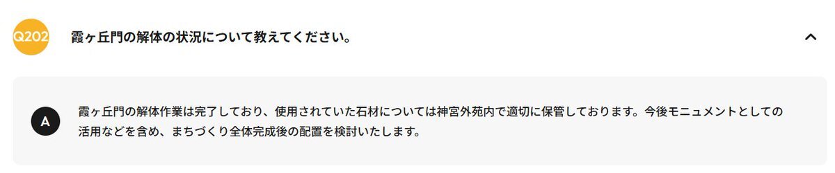 Q:霞ヶ丘門の解体の状況について教えてください。 A:霞ヶ丘門の解体作業は完了しており、使用されていた石材については神宮外苑内で適切に保管しております。今後モニュメントとしての活用などを含め、まちづくり全体完成後の配置を検討いたします。 #神宮外苑地区まちづくり #JinguGaien pic.x.com/ehvj4HkUCX
