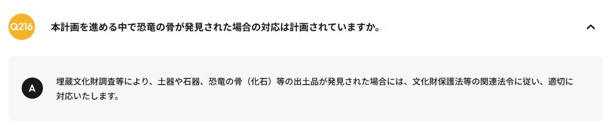 Q:本計画を進める中で恐竜の骨が発見された場合の対応は計画されていますか。 A:埋蔵文化財調査等により、土器や石器、恐竜の骨(化石)等の出土品が発見された場合には、文化財保護法等の関連法令に従い、適切に対応いたします。 #神宮外苑地区まちづくり #JinguGaien jingugaienmachidukuri.jp/faq/#anchor14 pic.x.com/xGkCMVxV8v