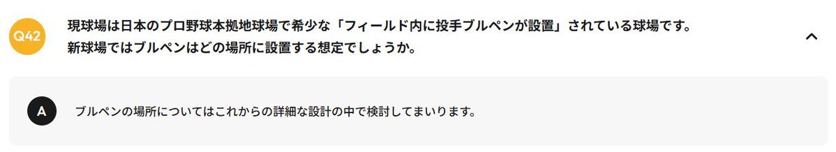 Q:現球場は日本のプロ野球本拠地球場で希少な「フィールド内に投手ブルペンが設置」されている球場です。 新球場ではブルペンはどの場所に設置する想定でしょうか。 A:ブルペンの場所についてはこれからの詳細な設計の中で検討してまいります。 #神宮外苑地区まちづくり #JinguGaien #神宮球場 pic.x.com/C0oGUhgZiK