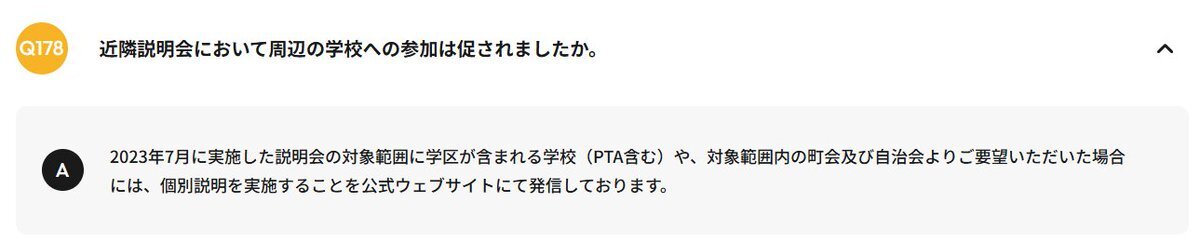 A:2023年7月に実施した説明会の対象範囲に学区が含まれる学校(PTA含む)や、対象範囲内の町会及び自治会よりご要望いただいた場合には、個別説明を実施することを公式ウェブサイトにて発信しております。 #神宮外苑地区まちづくり #JinguGaien #近隣説明会 jingugaienmachidukuri.jp/faq/#anchor13 pic.x.com/kZTtv7EAGm