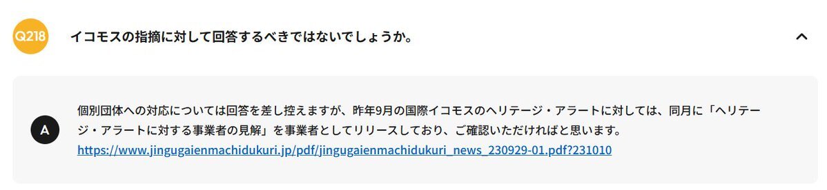A:個別団体への対応については回答を差し控えますが、昨年9月の国際イコモスのヘリテージ・アラートに対しては、同月に「ヘリテージ・アラートに対する事業者の見解」を事業者としてリリースしており、ご確認いただければと思います。 jingugaienmachidukuri.jp/pdf/jingugaien… #神宮外苑地区まちづくり #JinguGaien pic.x.com/3UkAwuDTye
