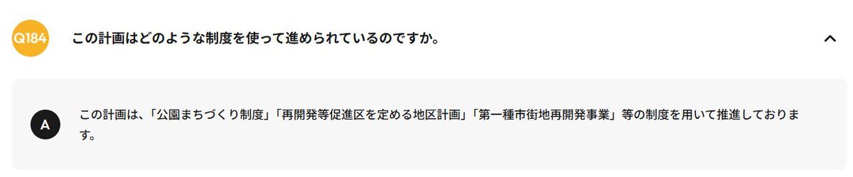 Q:この計画はどのような制度を使って進められているのですか。 A:この計画は、「公園まちづくり制度」「再開発等促進区を定める地区計画」「第一種市街地再開発事業」等の制度を用いて推進しております。 #神宮外苑地区まちづくり #JinguGaien jingugaienmachidukuri.jp/faq/#anchor14 pic.x.com/jQNjVWZ74L