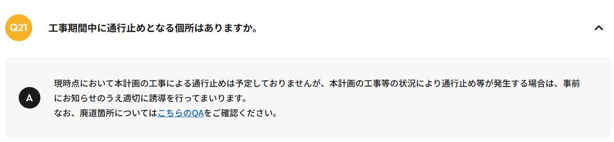 A:現時点において本計画の工事による通行止めは予定しておりませんが、本計画の工事等の状況により通行止め等が発生する場合は、事前にお知らせのうえ適切に誘導を行ってまいります。 なお、廃道箇所についてはこちらのQA jingugaienmachidukuri.jp/faq/#q189 をご確認ください。 #神宮外苑地区まちづくり pic.x.com/nHC5upccs1