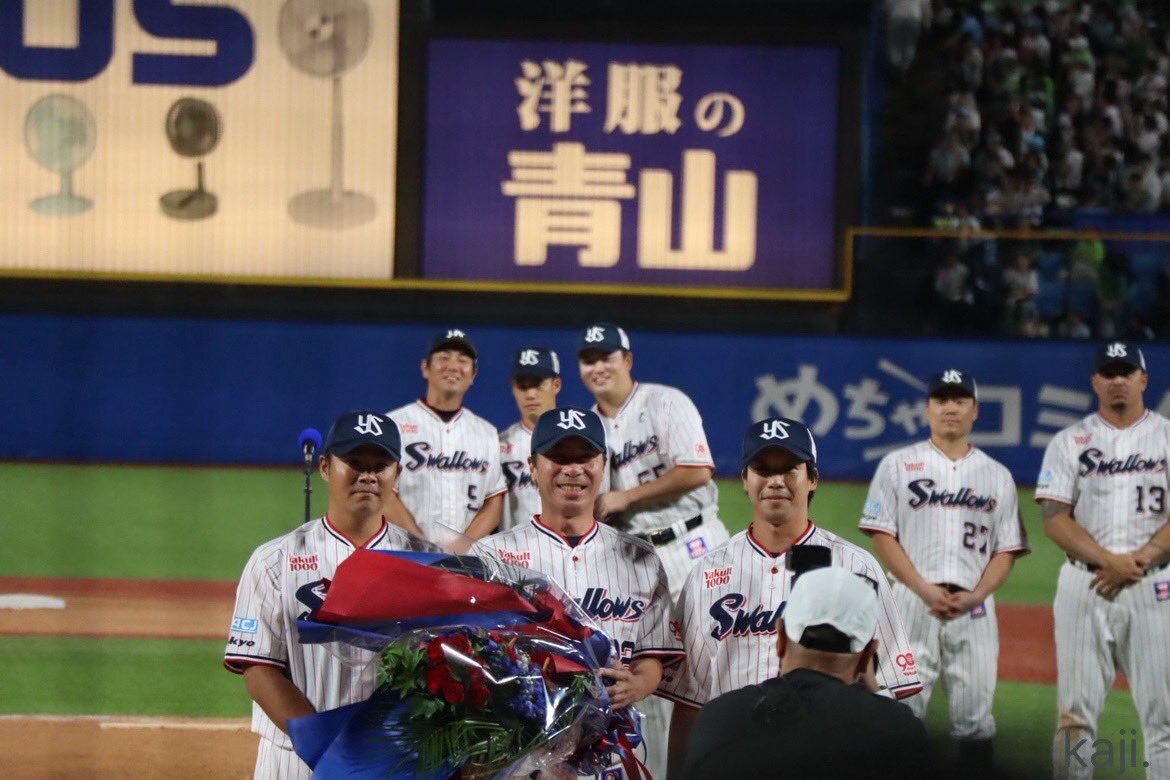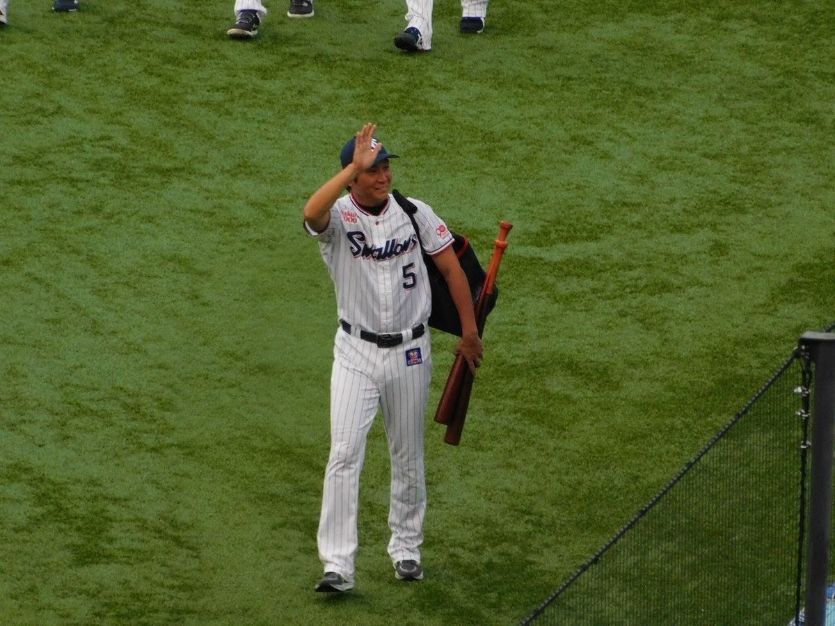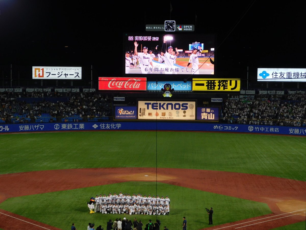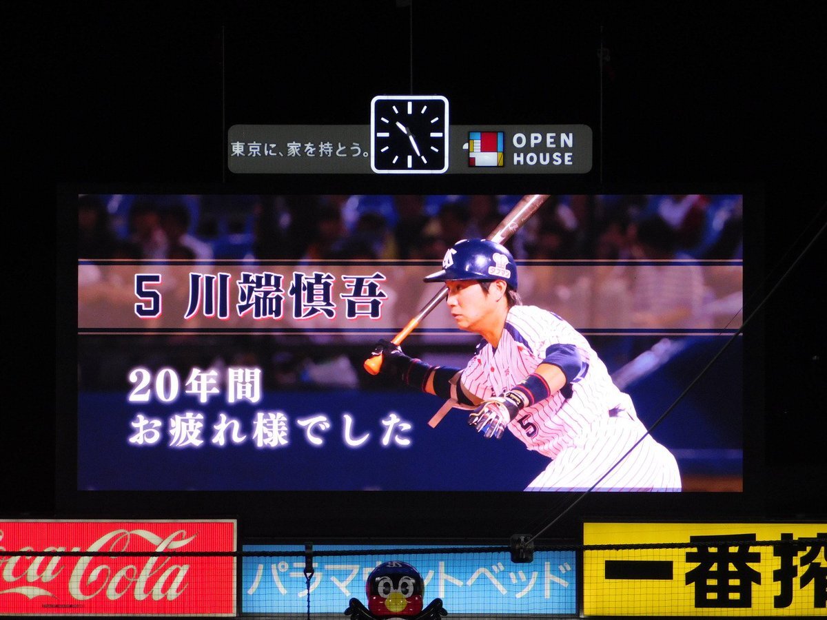 お別れの時。 20年間お疲れ様でした。 個人的な思い出は2012.8.25 復刻ユニフォームを着用してのナゴヤドームでの試合。 館山昌平投手最後の完封勝利。最初で最後の1-0完封試合でのレフト犠牲フライ。 #川端慎吾 #神宮最終戦 pic.x.com/IhhhaQH8lM