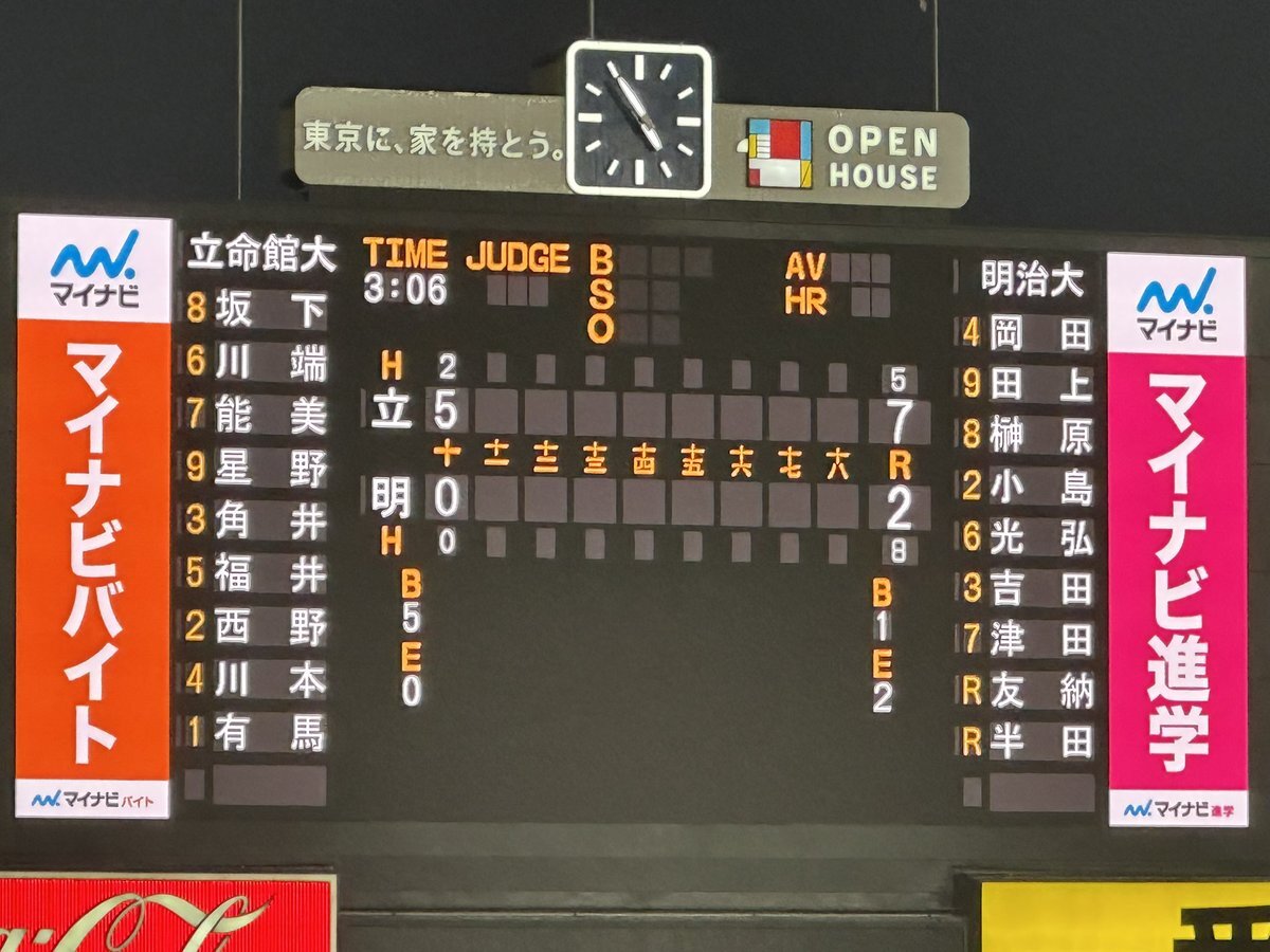 タイブレークって余り自分は好きにはならないな。メジャーじゃないが何回でも決着をと思ってしまう…高校生であれば身体が出来ていないからやむを得ないが(個人的には12回からで良くね!?)、大学はどうなんだろう。 タイブレークで5点。正直、勝負あったかな…無敗の明治が遂にかな? #神宮野球大会
