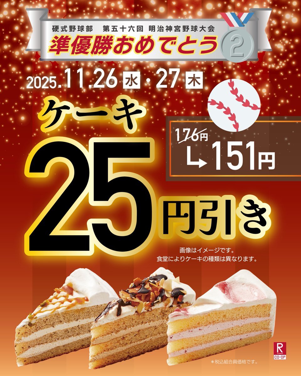 硬式野球部 明治神宮野球大会 準優勝おめでとうございます🥈 初めての決勝進出⚾️ 快進撃をお祝いしましょう! ✨️⭐️✨️⭐️✨️⭐️✨️ 11月26日(水)・27日(木) 🍰ケーキ25円引き🍰 通常176円→151円‼️ ✨️⭐️✨️⭐️✨️⭐️✨️️ #立命館 #神宮野球大会 pic.x.com/yF0MQKEIB1