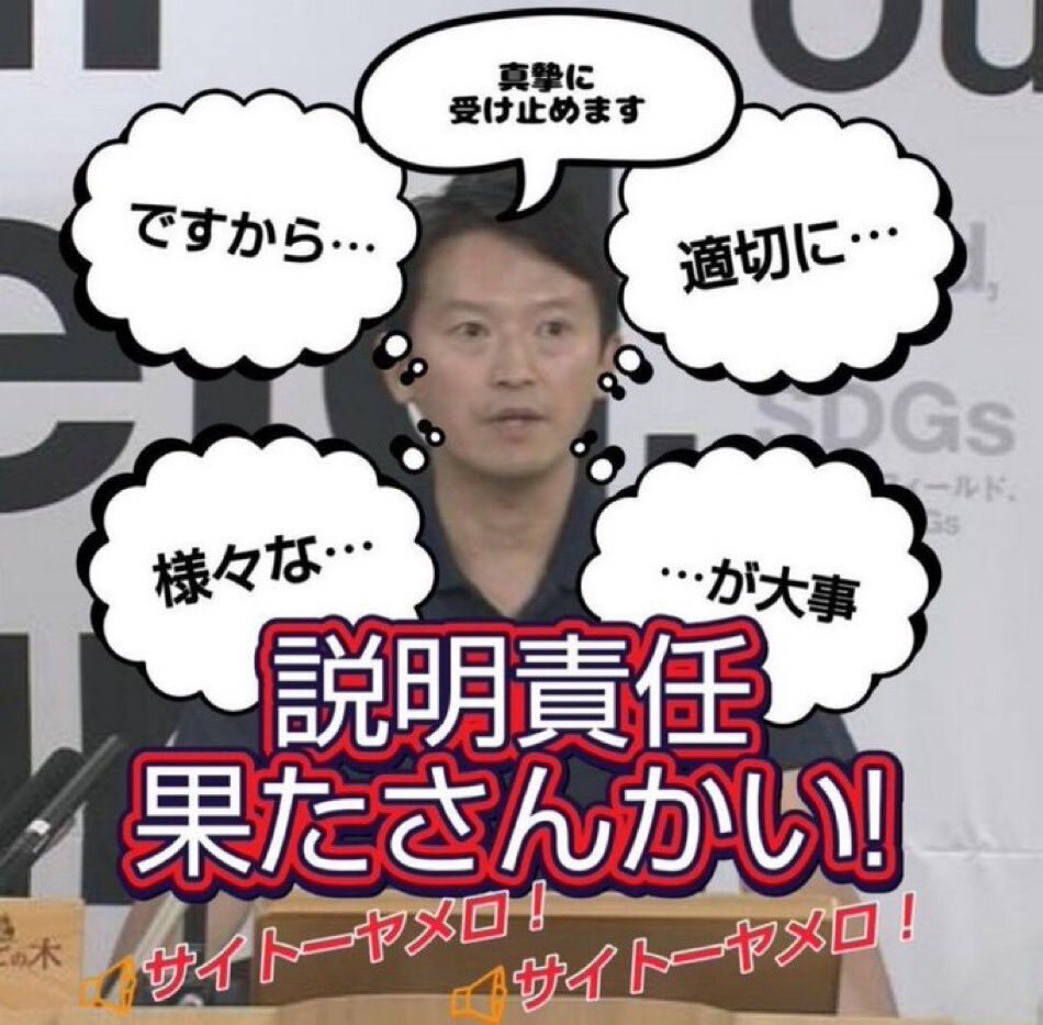 返信先:@uIBsWxEYdt40238#さいとうヤメロ #神戸地検がんばれ さいとうさん「コメントは差し控える」ってコメントしたら余程都合悪いの⁉️ 2馬力をお願いした立花孝志による「斎藤さんは悪くない、陥れられた」等のデマで県民騙して再選出来たのだから、潔く認めて行政の長として説明責任を果たせ‼️😡