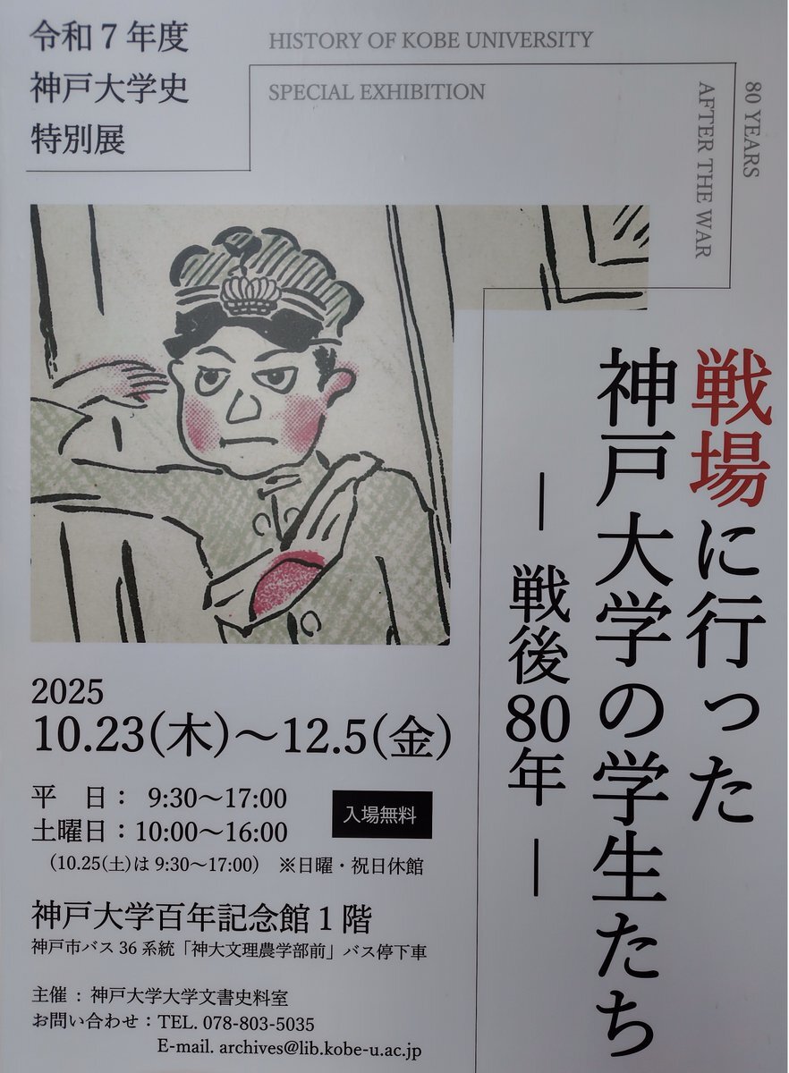 戦後80年、神戸文学館と神戸大学で同じような、戦場に行った学生の展示がありました。先日、文学館に出かけ、今日は天気がよく、神戸大学百年記念館です。開催中の「六甲祭」ものぞきました。研究公開が少ないのが残念です。 #神戸文学館 #神戸大学百年記念館 #神戸大学文書史料室 #六甲祭 #神戸大学 pic.x.com/8qbNh38XvW