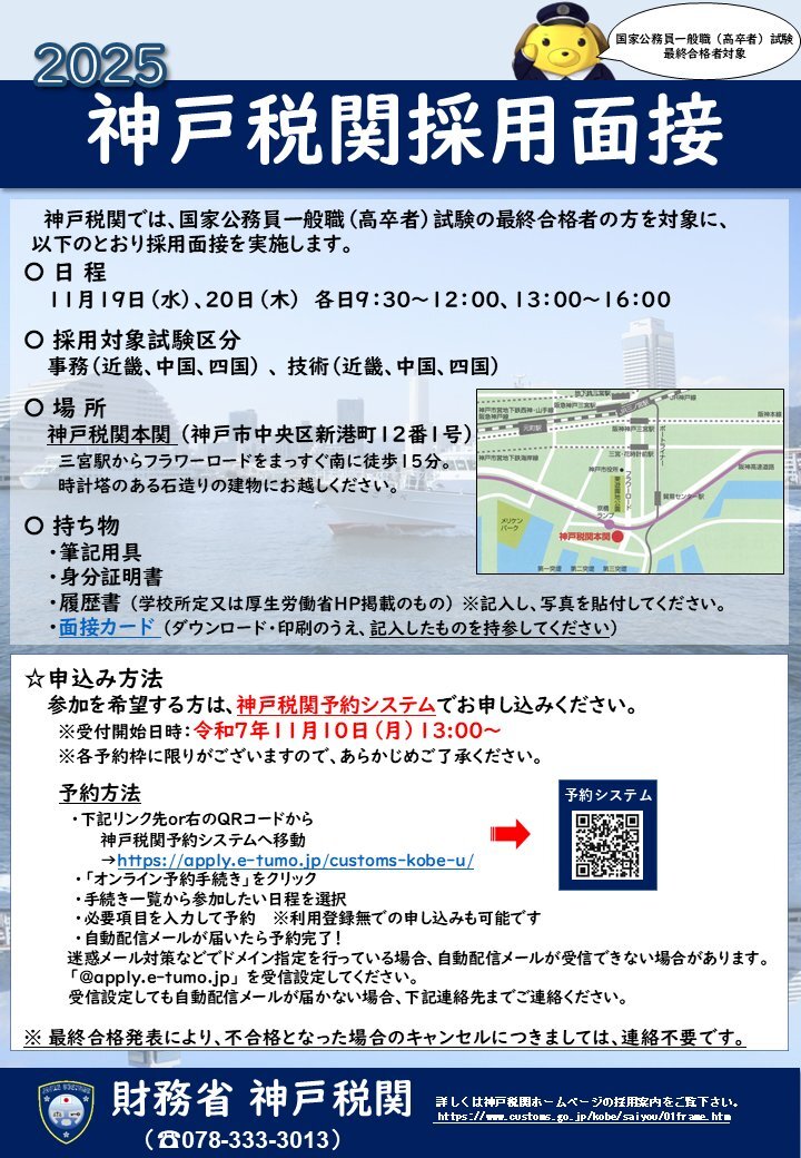 【採用案内】 #神戸税関 では国家公務員一般職(高卒者)試験最終合格者を対象に、11/19(水)、20(木)の日程で採用面接を実施するワン!11/10(月)から予約受付開始だワン!みなさんのご参加お待ちしてるワン!詳細はこちら→customs.go.jp/kobe/saiyou/da… #税関 #国家公務員 #採用面接 pic.x.com/onuq0LtNMC