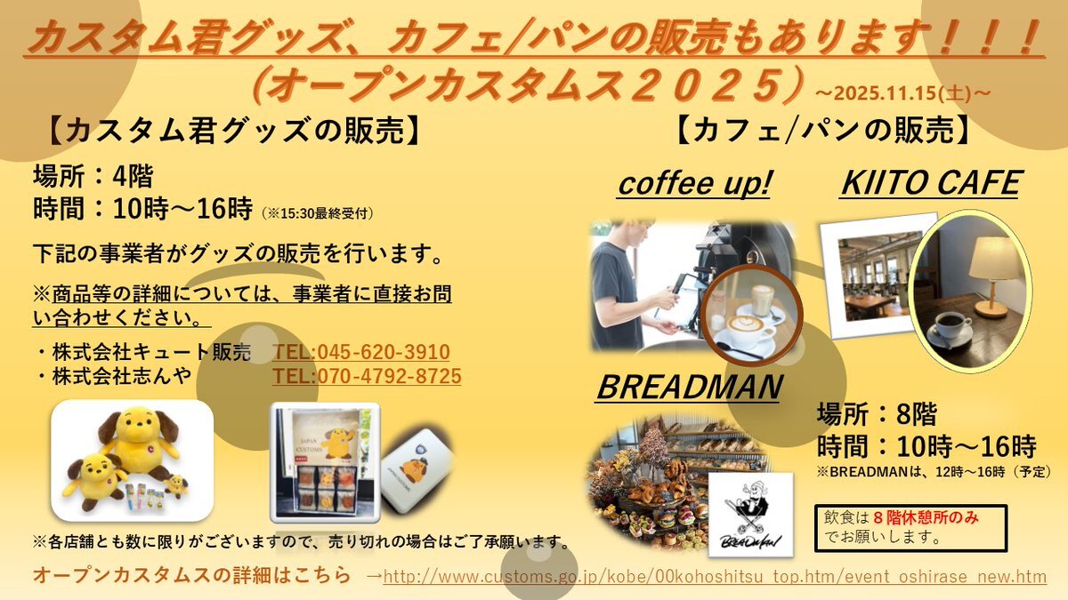 【イベント】 オープンカスタムス2025では、業者による、カスタム君グッズの販売、パンの販売、カフェの提供もあるみたいだワン! customs.go.jp/kobe/00kohoshi… #税関 #神戸税関 #オープンカスタムス2025 #カスタム君 pic.x.com/mmjRrbNG6m x.com/Custom_kun/sta…