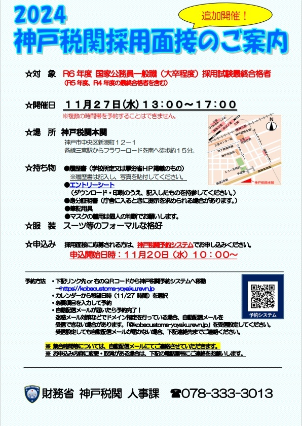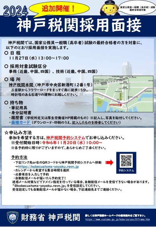 【採用情報】【神戸税関】【追加採用面接(大卒者・高卒者)のお知らせ】 国家公務員一般職(大卒者及び高卒者)試験最終合格者を対象に、11/27(水)に追加採用面接を実施するワン!現在予約受付中だワン! #神戸税関 #採用面接 #国家公務員 #国家一般職 #就活 #公務員 pic.x.com/f2ypfPnfqN