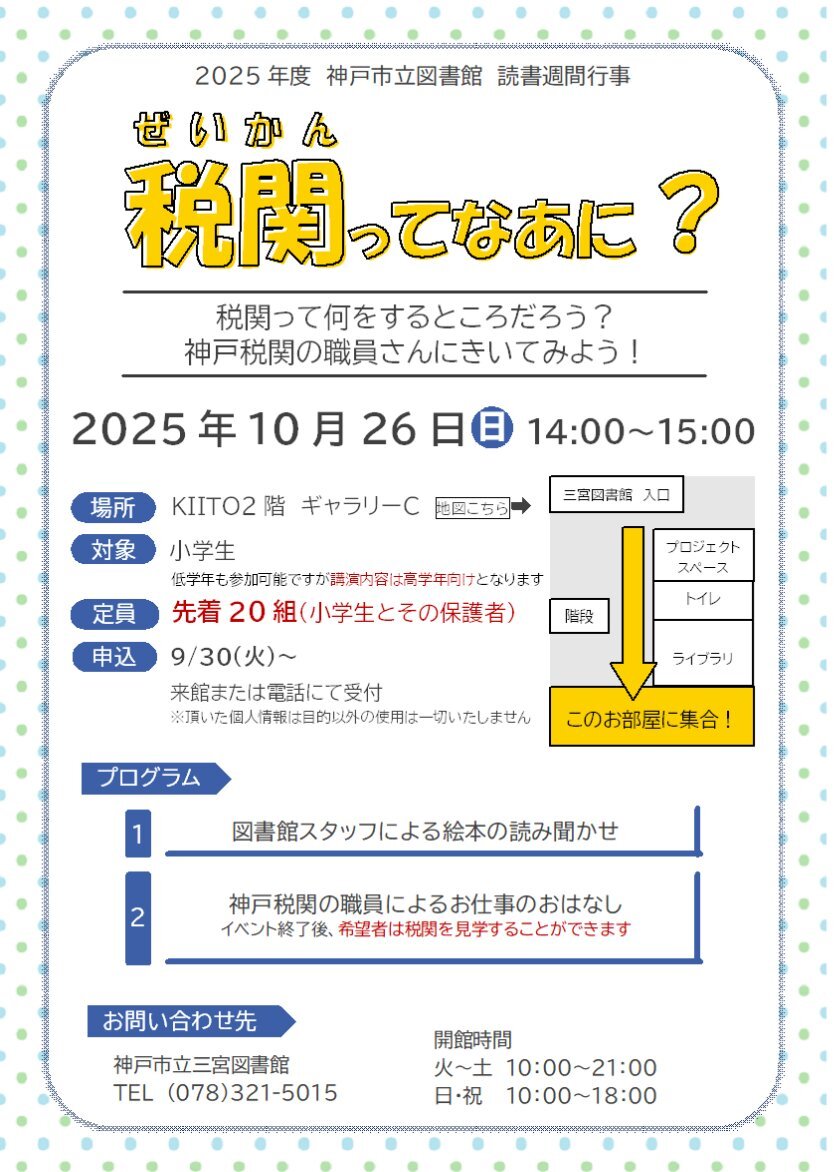 【税関ってなあに?@#三宮図書館#神戸税関 の職員さんをお招きして 税関のお仕事についてレクチャーしてもらいます。 港のお仕事についての絵本の読み聞かせもあります。 10/26(日)14時~15時。参加無料。 申込078-321-5015(神戸市立三宮図書館) pic.x.com/OoFkFEpx5y