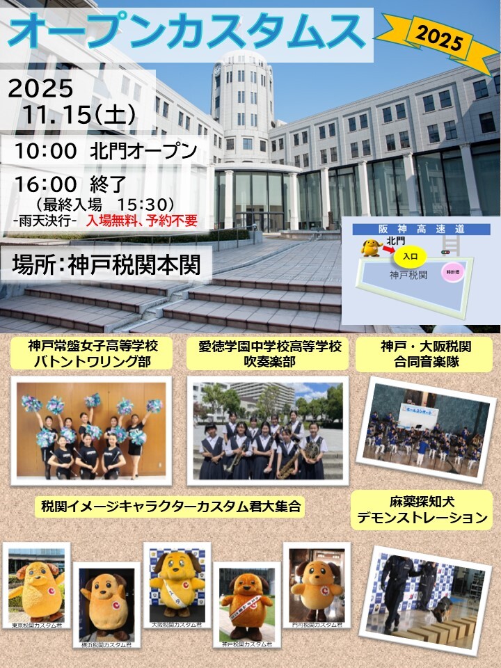 神戸税関で「オープンカスタムス2025」が11月15日(土)に開催予定!屋上や元貴賓室の公開、コンサートや麻薬探知犬のデモンストレーションなどのプログラムの他、カスタム君グッズ、カフェ/パンの販売も企画されているみたい #神戸税関 #オープンカスタムス higashinada-journal.com/event/108558/