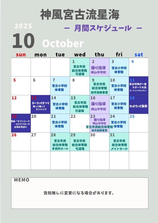 10月のイベント・練習会の情報です☆彡 時間の都合がつく方は私たちのイベントに足を運んでいただけると嬉しいです‼️ また、見学や体験会を希望の方は、事前に本アカウントのDMまでご連絡下さい☆彡 #よさこい #神風宮古流星海 pic.x.com/Npf0ooWnSN