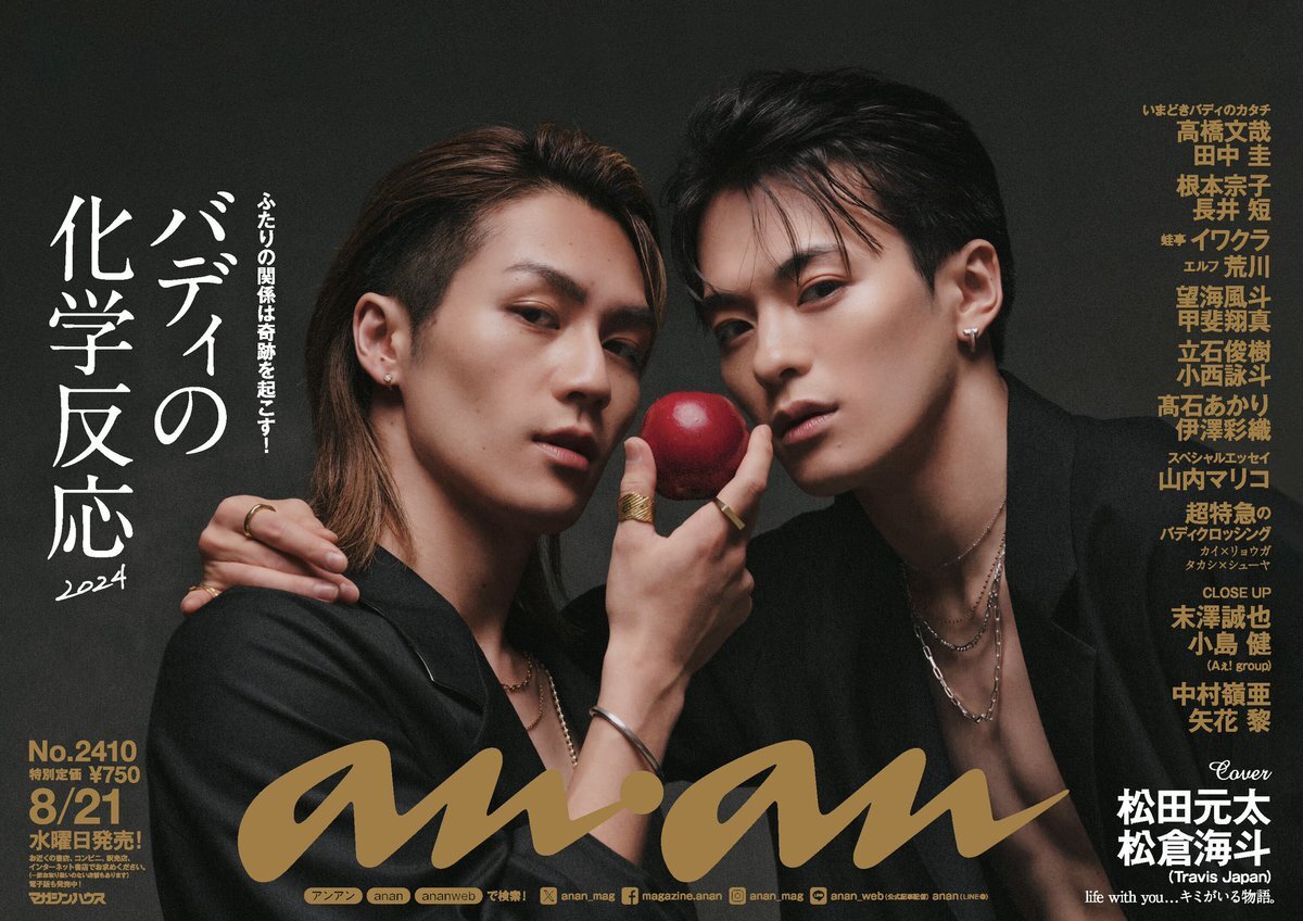 #anan 最新号中吊り公開】 #バディの化学反応2024 特集の表紙は #TravisJapan #松田元太 さん #松倉海斗 さん。中吊りには #禁断の果実 りんごを手にした #色気爆発 の #オトナ松松 が降臨。#松松伝説 に名を刻むメモリアルな #松松バディ 表紙をお見逃しなく。2410号、明日発売! #anan中吊り pic.x.com/IN3vlefLMO
