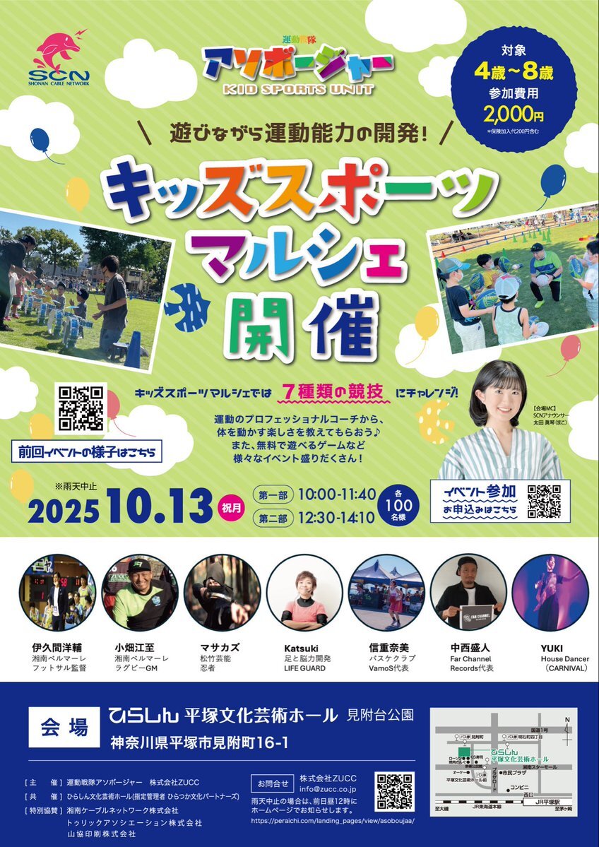 キッズスポーツマルシェ。 今週末の連休最終の13日(月・祝)です。 ニンジャトレーニングやりますよ! 神奈川県平塚市です! 忍者以外にもサッカー、ラグビー、バスケ、ダンス、ドラムス、足育(足部能力UP)。 合計7競技を体験できるイベントです。 ぜひぜひお申し込み下さい! しっかり仕込みます!