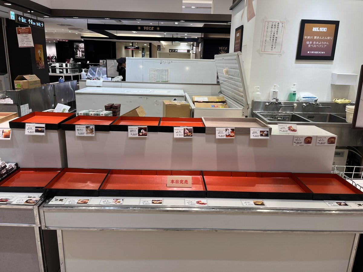 #中津川栗きんとん祭り #福井の冬水ようかんフェア #新宿高島屋 で今日11/12からスタートしましたが、開店時から多くのお客様にお越し頂きまして、本当にありがとうございます♪#栗きんとん は夕方には全てが完売し、それ以外の栗菓子も昨年より早く完売となりました。本当にありがとうございます。 pic.x.com/qG3qrxidlX