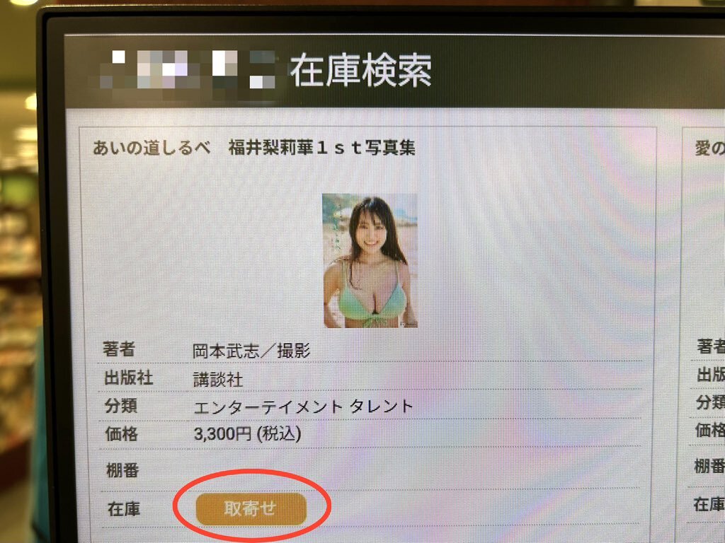 地元の最大級の書店に行き、写真集コーナーに行ったら、やはり『 #あいの道しるべ 』が見当たらない。 在庫検索をかけたら「取寄せ」表示に。 店長さん、取寄せ希望を待つんじゃなくて「補充」してください! #福井梨莉華 #福井梨莉華1st写真集 pic.x.com/THBrUBMDot