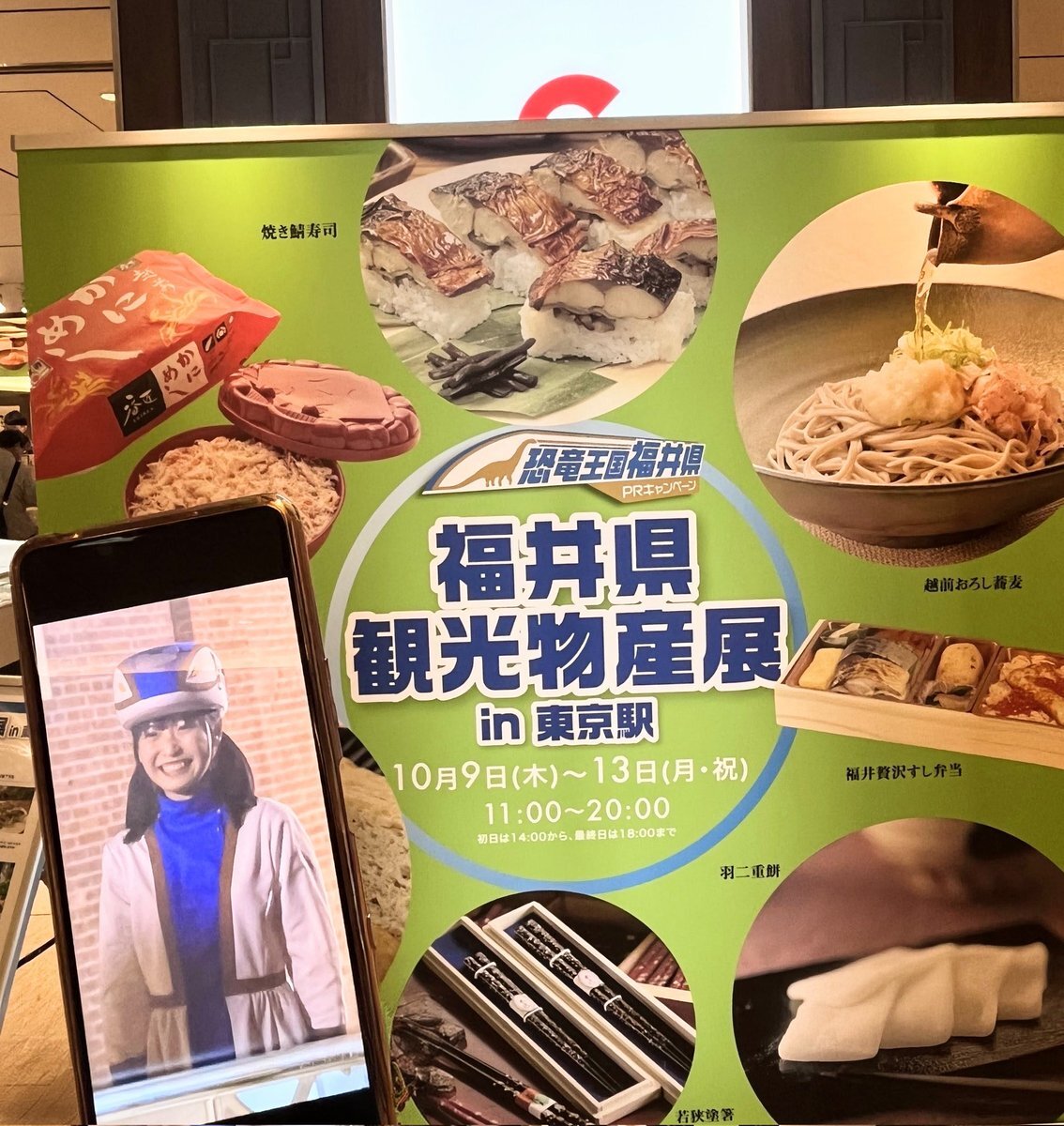 東京駅で開かれている、#福井県観光物産展 へ行ってきました‼️ 『#かがやきちゃん』に会えなかったのは悔やまれますが、念願の #恐竜博士 に会えましたし、駅弁『#竜のめぐみ』もゲットできて満足です👍とっても美味しかったです🦀🦖 #坂川陽香 #福井県 #福井ブランド大使 #AKB48 pic.x.com/FLK8o7jxU6