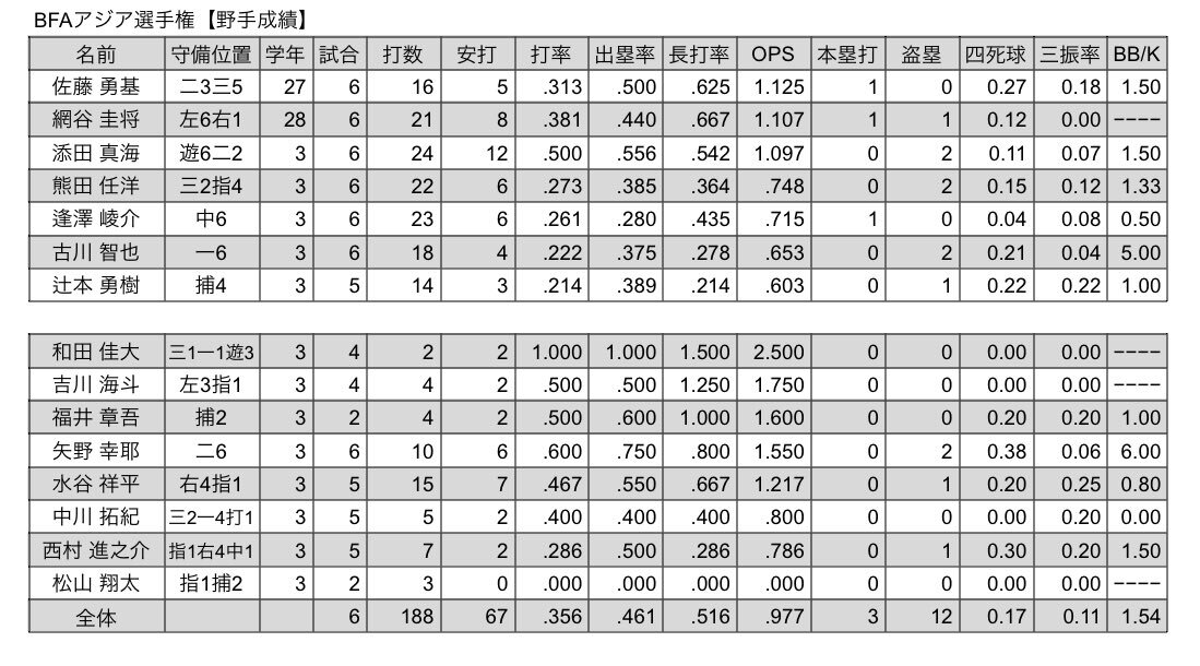 ◯打者成績 ■OPS(16打席以上) 佐藤勇基 1.125 網谷圭将 1.107 添田真海 1.097 熊田任洋 .748 逢澤崚介 .715 古川智也 .653 辻本勇樹 .603 ■OPS(16打席未満) 和田佳大 2.500 吉川海斗 1.750 福井章吾 1.600 矢野幸耶 1.550 水谷祥平 1.217 中川拓紀 .800 西村進之介 .786 松山翔太 .000